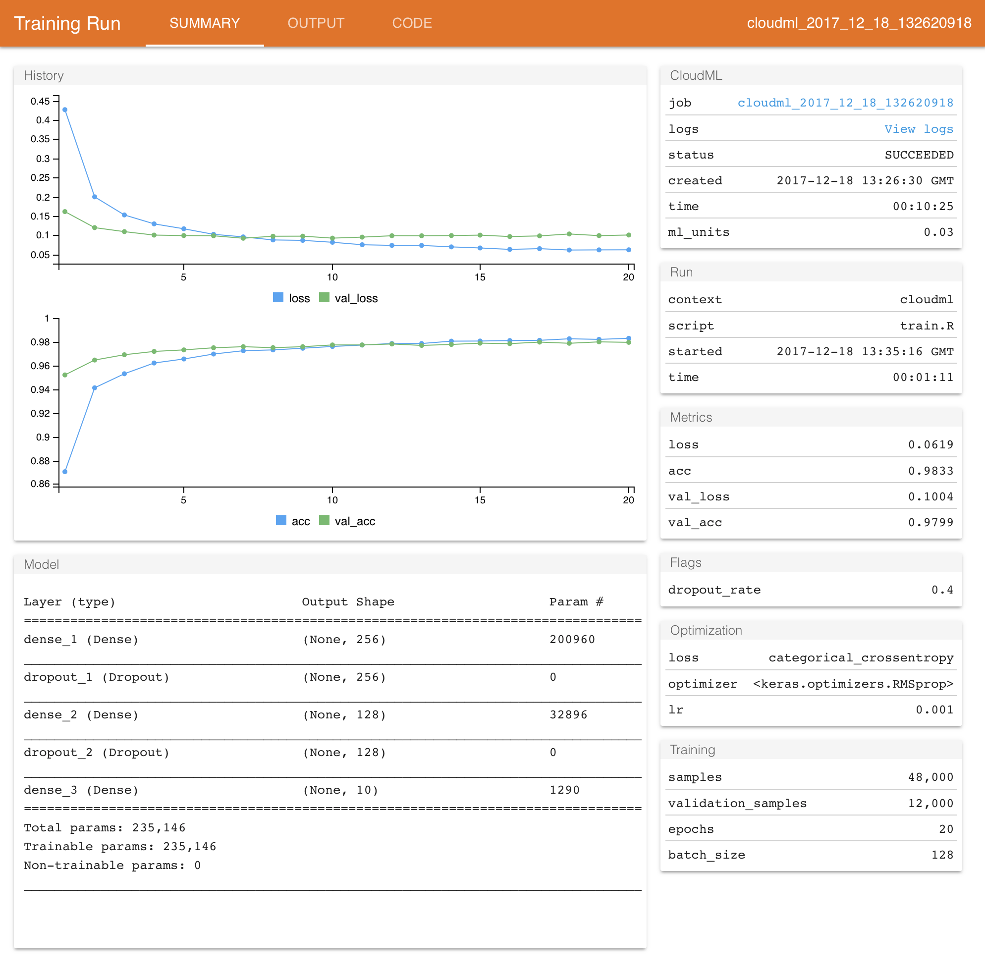 Once you’ve configured your system to publish to CloudML, training a model is as straightforward as calling the cloudml_train() function: