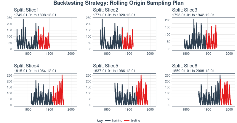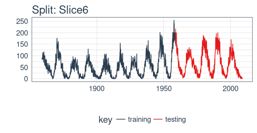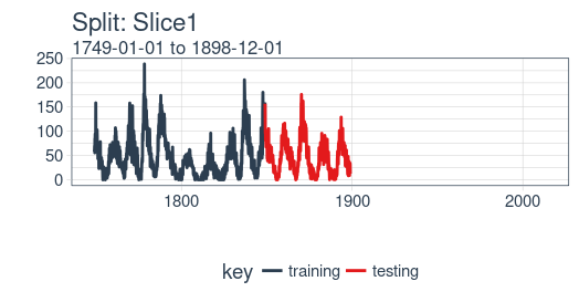 # Plotting function for a single splitplot_split<-function(split,expand_y_axis=TRUE,alpha=1,size=1,base_size=14){# Manipulate datatrain_tbl<-training(split)%>%add_column(key="training")test_tbl<-testing(split)%>%add_column(key="testing")data_manipulated<-bind_rows(train_tbl,test_tbl)%>%as_tbl_time(index=index)%>%mutate(key=fct_relevel(key,"training","testing"))# Collect attributestrain_time_summary<-train_tbl%>%tk_index()%>%tk_get_timeseries_summary()test_time_summary<-test_tbl%>%tk_index()%>%tk_get_timeseries_summary()# Visualizeg<-data_manipulated%>%ggplot(aes(x=index,y=value,color=key))+geom_line(size=size,alpha=alpha)+theme_tq(base_size=base_size)+scale_color_tq()+labs(title=glue("Split: {split$id}"),subtitle=glue("{train_time_summary$start} to ","{test_time_summary$end}"),y="",x="")+theme(legend.position="none")if(expand_y_axis){sun_spots_time_summary<-sun_spots%>%tk_index()%>%tk_get_timeseries_summary()g<-g+scale_x_date(limits=c(sun_spots_time_summary$start,sun_spots_time_summary$end))}g}