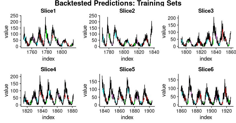 plot_train<-function(slice,name){ggplot(slice,aes(x=index,y=value))+geom_line()+geom_line(aes(y=pred_train1),color="cyan")+geom_line(aes(y=pred_train50),color="red")+geom_line(aes(y=pred_train100),color="green")+geom_line(aes(y=pred_train150),color="violet")+geom_line(aes(y=pred_train200),color="cyan")+geom_line(aes(y=pred_train250),color="red")+geom_line(aes(y=pred_train300),color="red")+geom_line(aes(y=pred_train350),color="green")+geom_line(aes(y=pred_train400),color="cyan")+geom_line(aes(y=pred_train450),color="red")+geom_line(aes(y=pred_train500),color="green")+geom_line(aes(y=pred_train550),color="violet")+geom_line(aes(y=pred_train600),color="cyan")+geom_line(aes(y=pred_train650),color="red")+geom_line(aes(y=pred_train700),color="red")+geom_line(aes(y=pred_train750),color="green")+ggtitle(name)}train_plots<-map2(all_split_preds_train$predict,all_split_preds_train$id,plot_train)p_body_train<-plot_grid(plotlist=train_plots,ncol=3)p_title_train<-ggdraw()+draw_label("Backtested Predictions: Training Sets",size=18,fontface="bold")plot_grid(p_title_train,p_body_train,ncol=1,rel_heights=c(0.05,1,0.05))