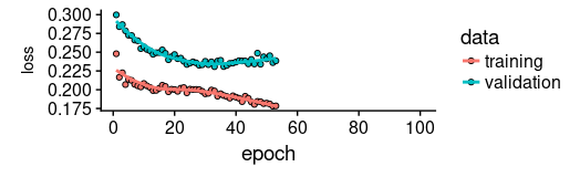 As we see, training was stopped after ~55 epochs as validation loss did not decrease any more.