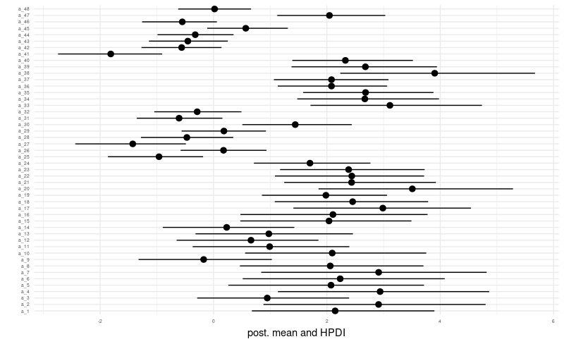 How about the posterior distributions of the parameters, first and foremost, the varying intercepts a_1 … a_48?