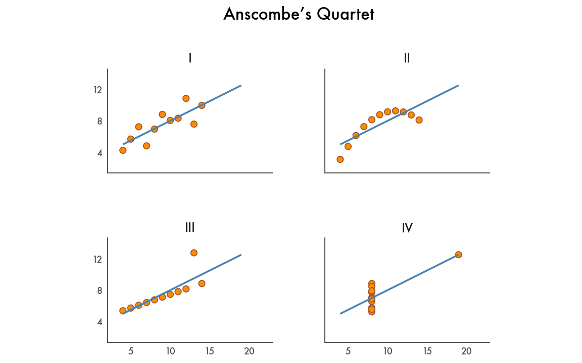 In 1973, statistician Francis Anscombe challenged the commonly held belief that “numerical calculations are exact, but graphs are rough” (Anscombe, 1973). His strategy was to manually construct four small datasets—now known as Anscombe’s Quartet—that have different distributions but nearly identical descriptive statistics. It’s perhaps the best argument for visualizing data.