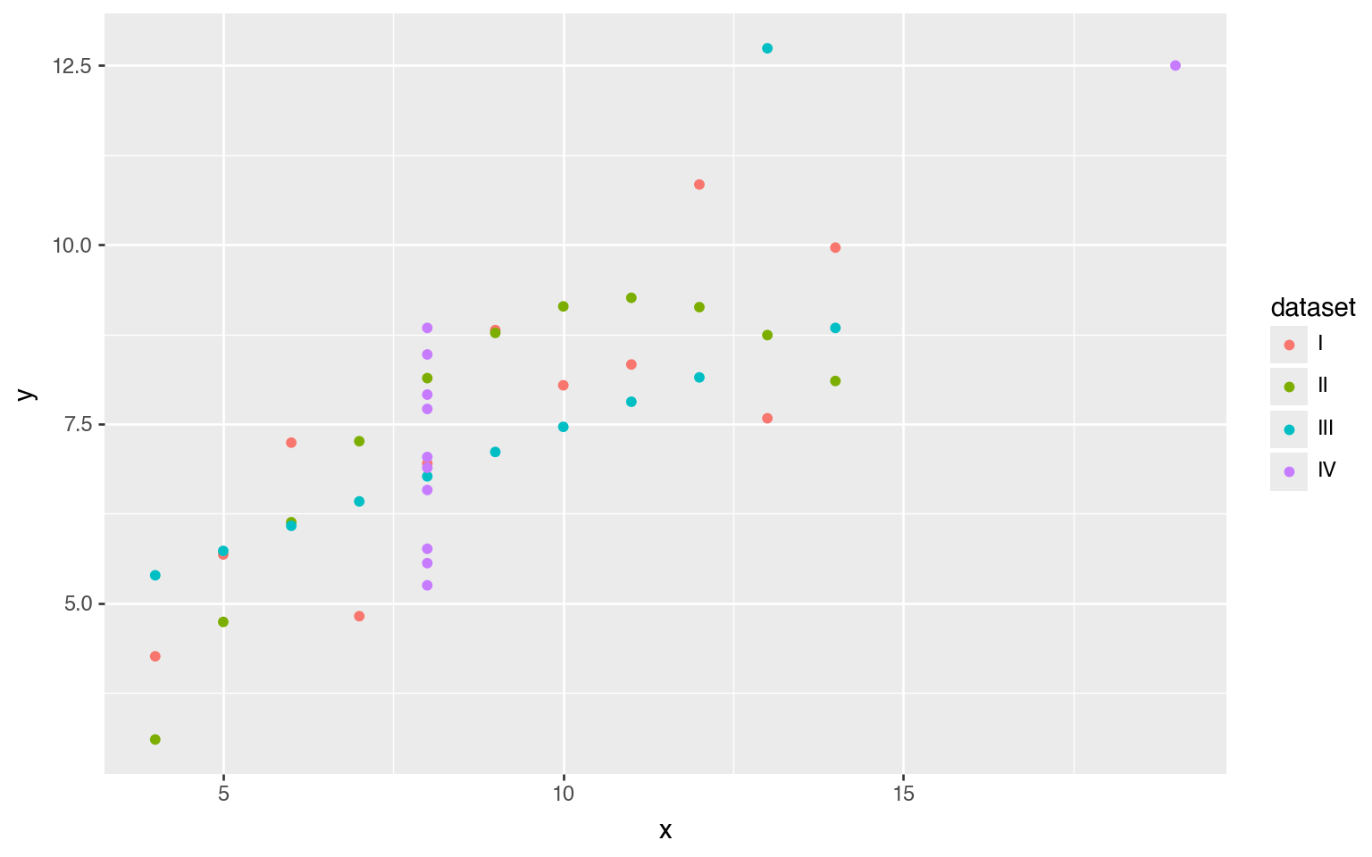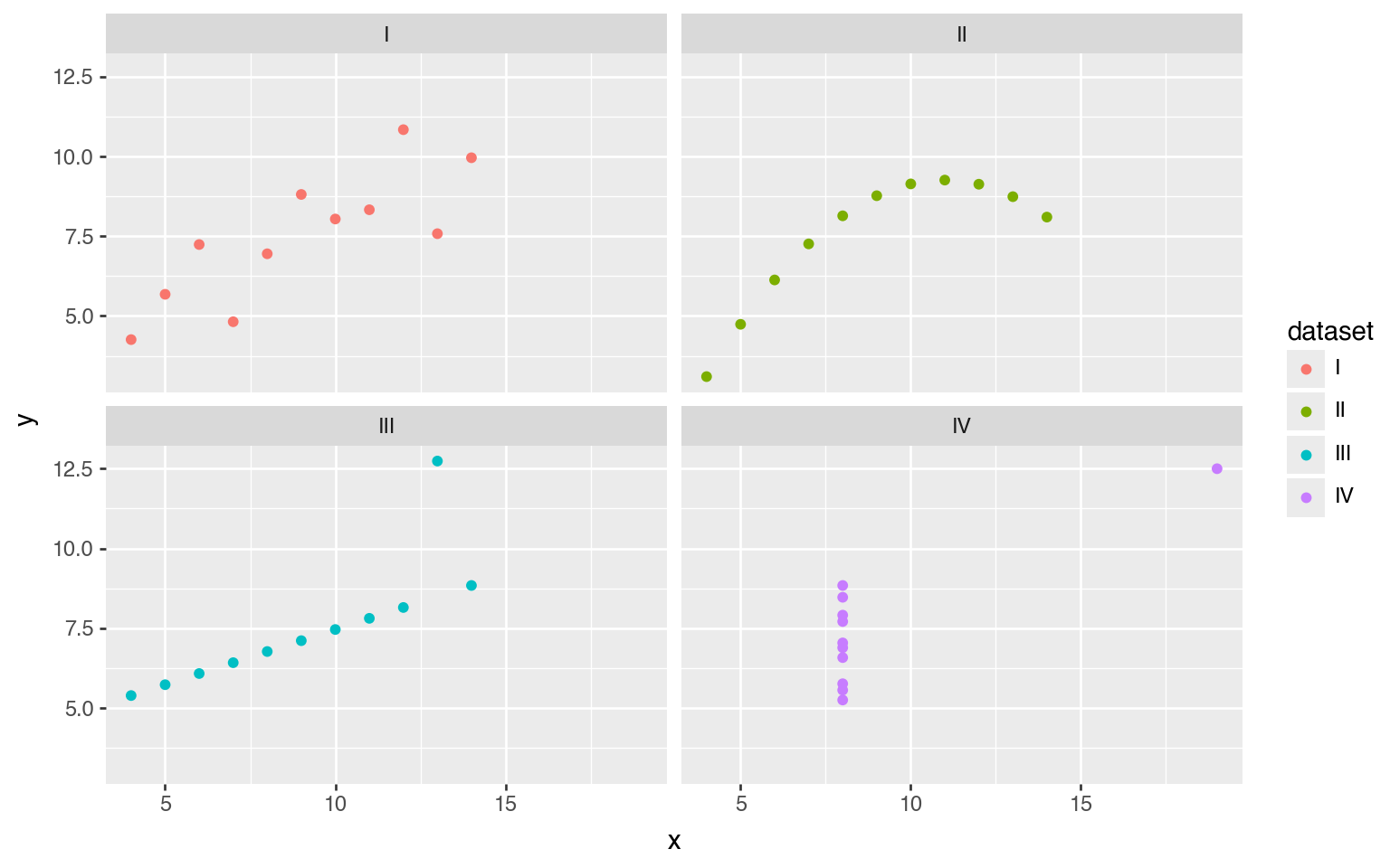 The column dataset indicates which rows belong to which dataset using the Roman numerals I through IV. (The Roman numerals are purely for visualization purposes.)