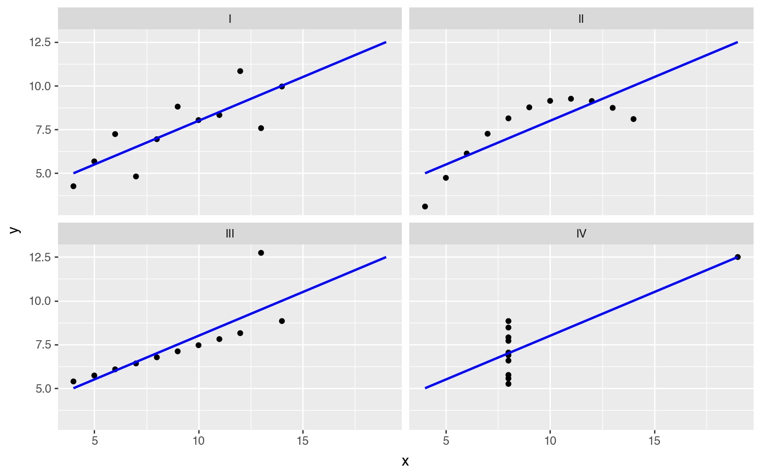 Let’s also add a regression line using the geom_smooth() function, to visualize that the four datasets have identical descriptive statistics.
