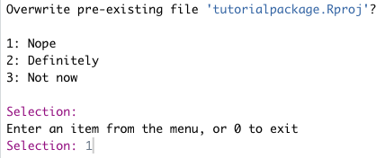 The console output will ask if you’d like to overwrite the pre-existing R project. Select No.