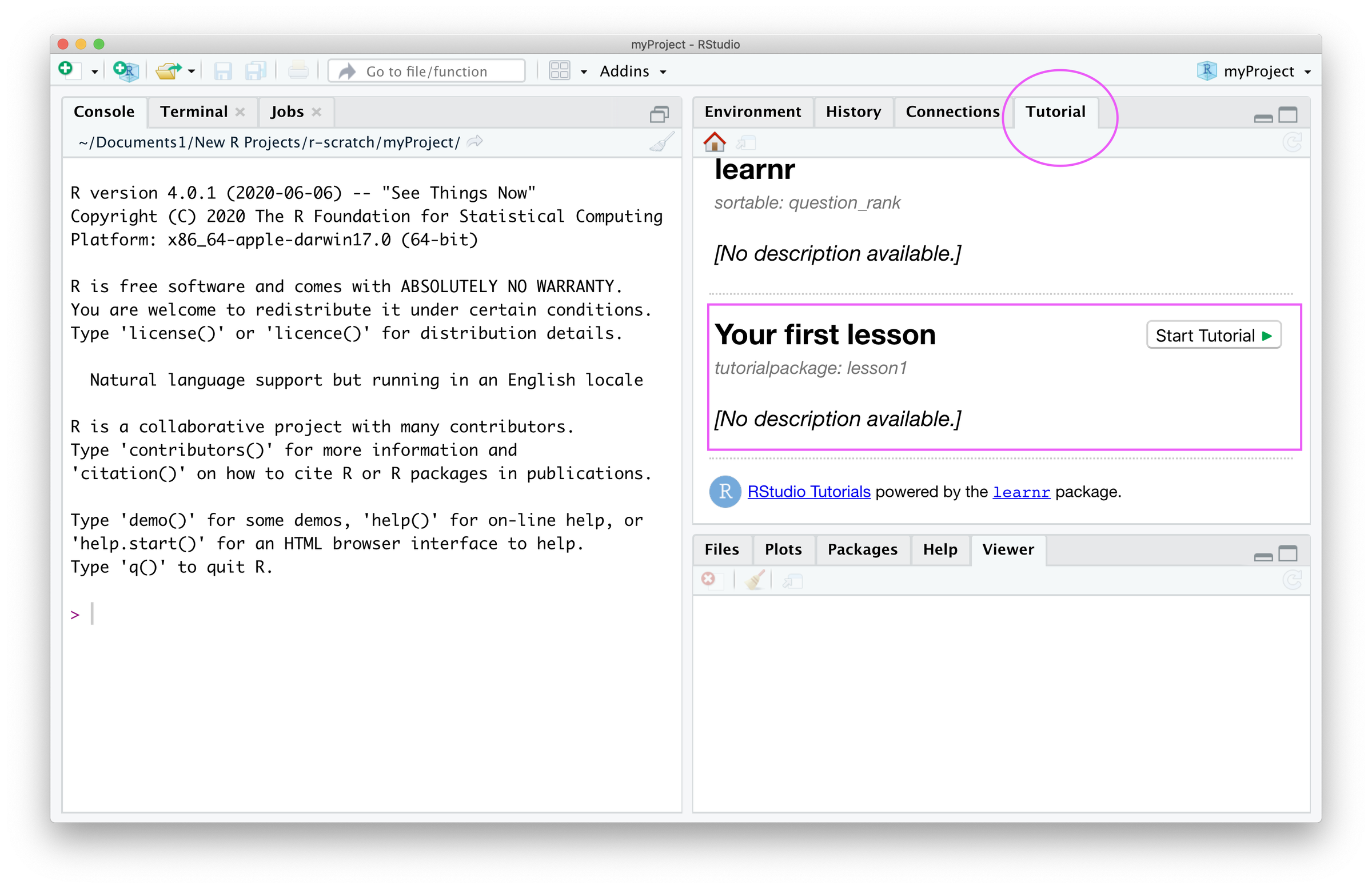 Navigate to the Tutorial pane of your RStudio IDE. All installed learnr tutorials in your R Library will be automatically indexed and displayed here.