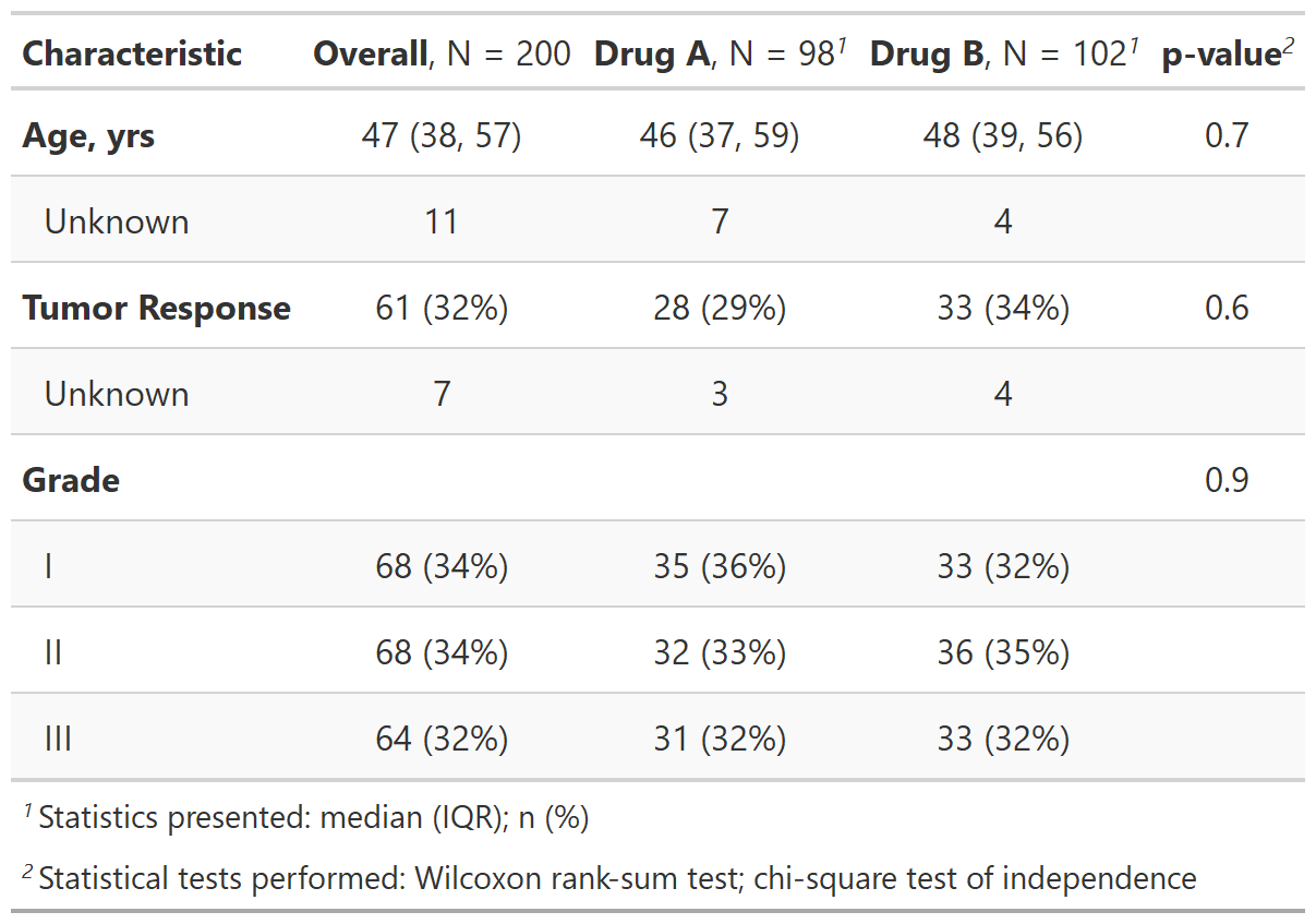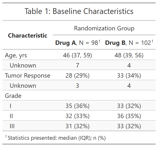 Throughout the post we will use an example dataset of 200 subjects treated with either Drug A or Drug B, with a mix of categorical, dichotomous, and continuous demographic and response data. The dataset has label attributes (using the labelled package) for column names.