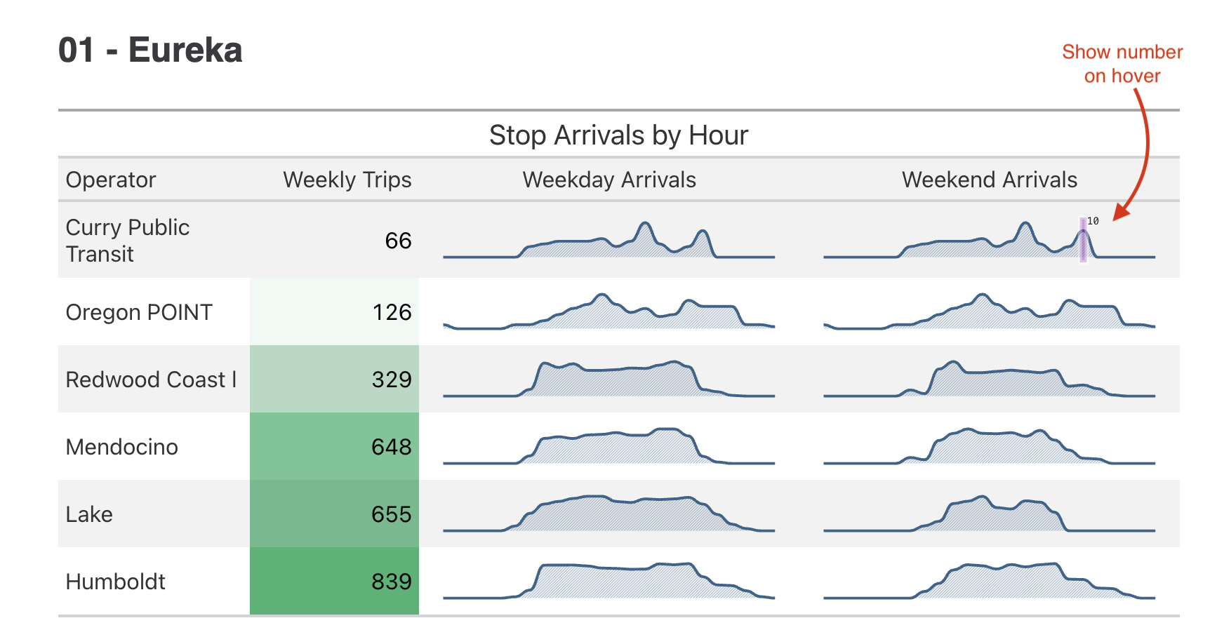 Our 2024 contest saw a great set of transit tables submitted by Tiffany Ku at CalTrans (submission , github repo ). The submission showed service patterns using stop times binned by hour. It produced these for all California operators!