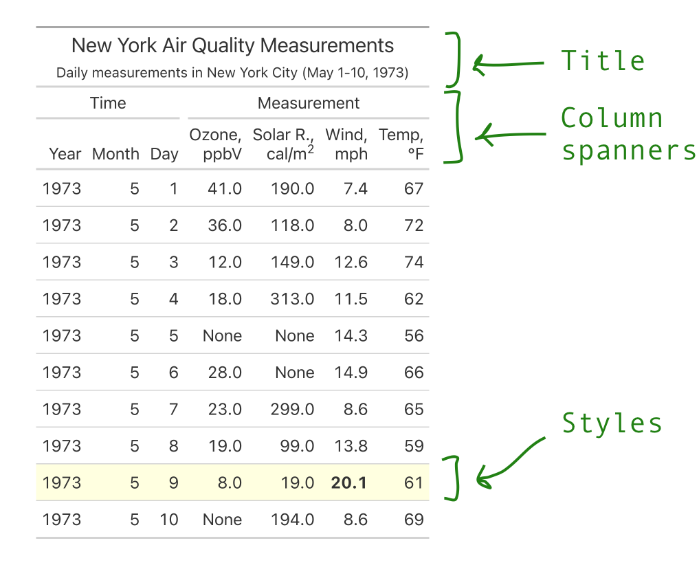 The simplest method in gt is GT.tab_header(), which lets you add a title and subtitle.