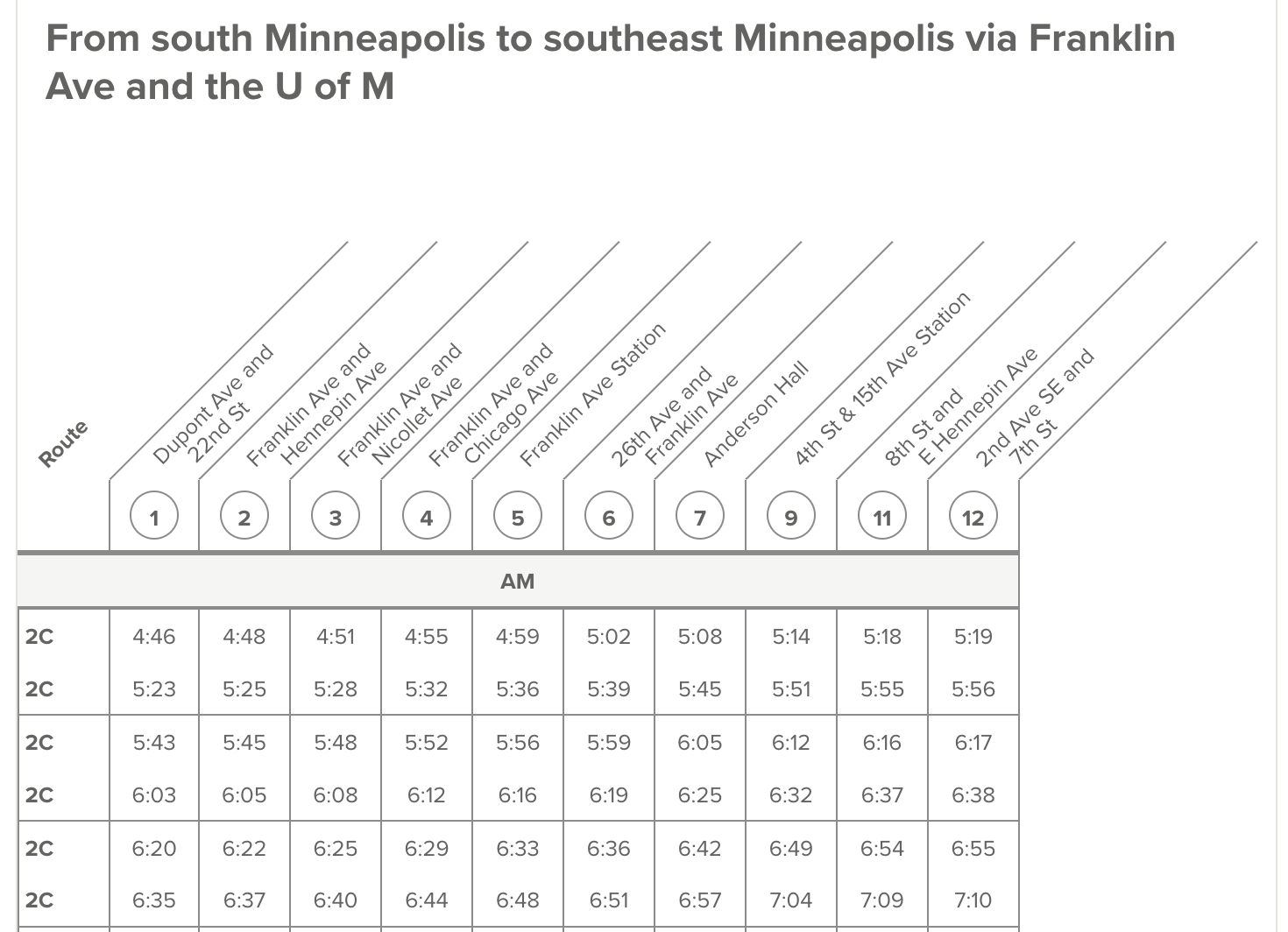 MetroTransit in Minneapolis uses a transposed format, with stops as columns and trips as rows. Here’s an example from their Route 2 bus timetable :