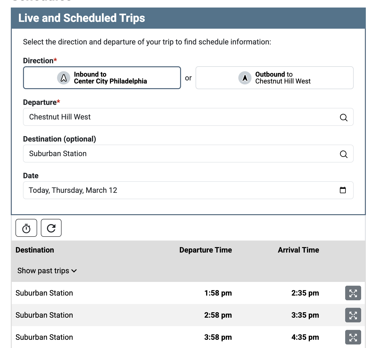 A common alternative to using these tables is to do routing from a set start to end point. For example, below is a form for selecting a start and end point on SEPTA’s website, with a resulting table of departure and arrival times.