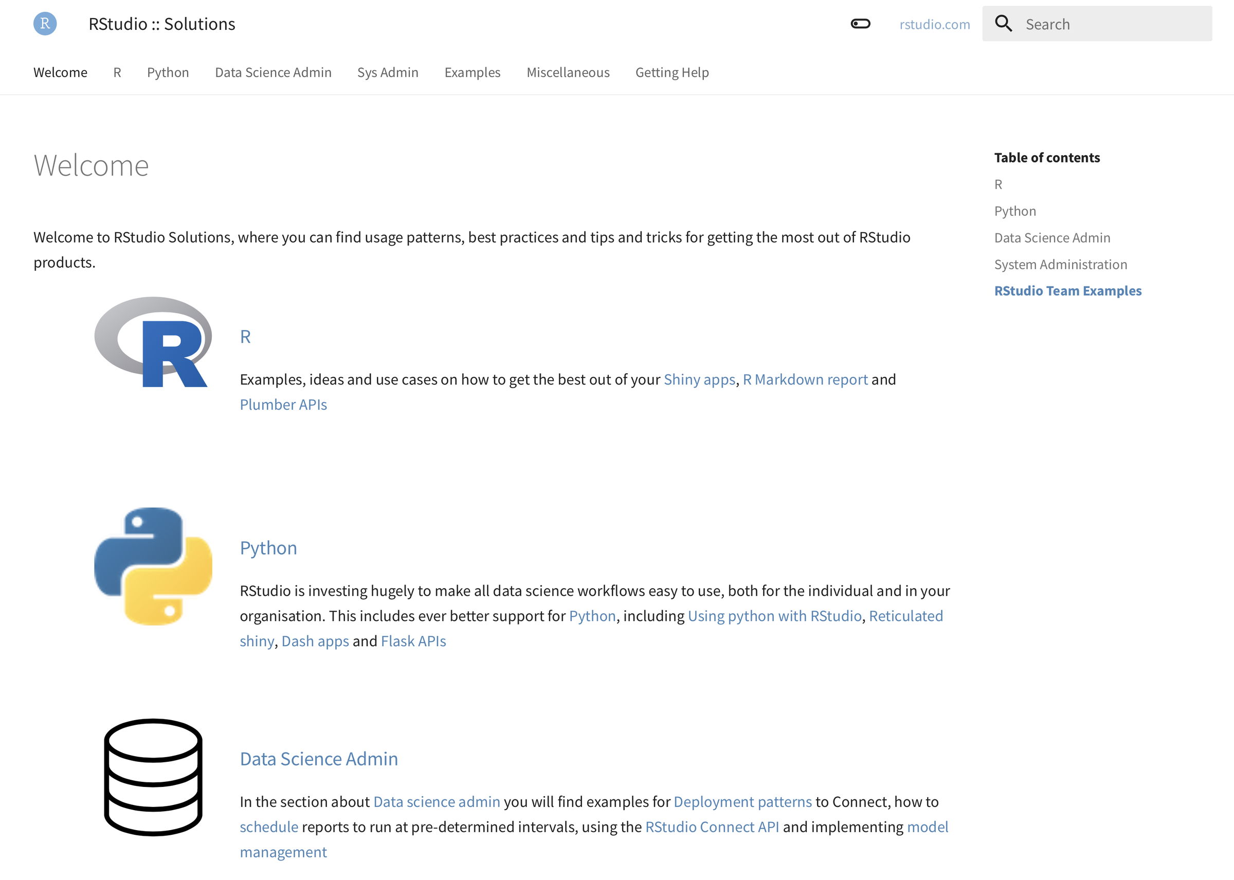 The documentation for each product is owned by the relevant product team, but we all contribute where necessary. One of the teams that spends the most time in the documentation is our Solutions Engineering team. It’s our SEs job to help our customers get the most from the products they’ve purchased. Oftentimes this help needs to go beyond configuration options and authentication mechanisms and for that, we have the solutions website, solutions.rstudio.com.
