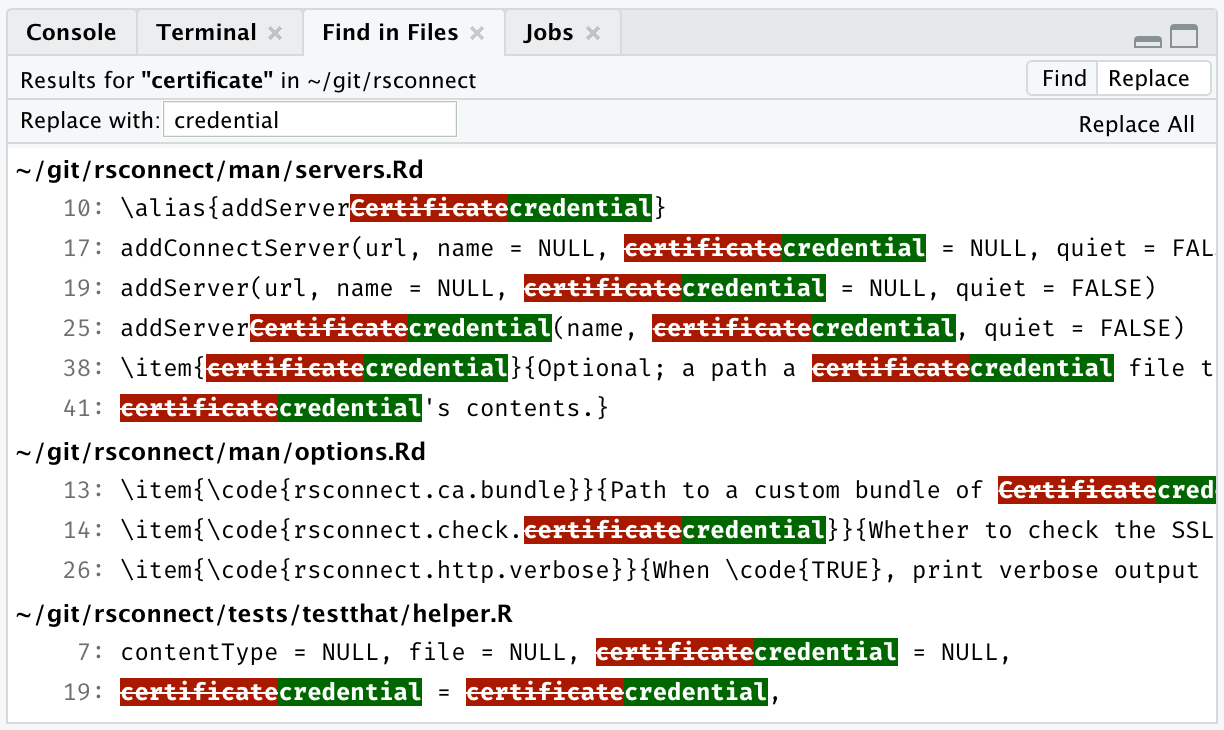 In RStudio 1.3, it’s now possible to replace the text you found: