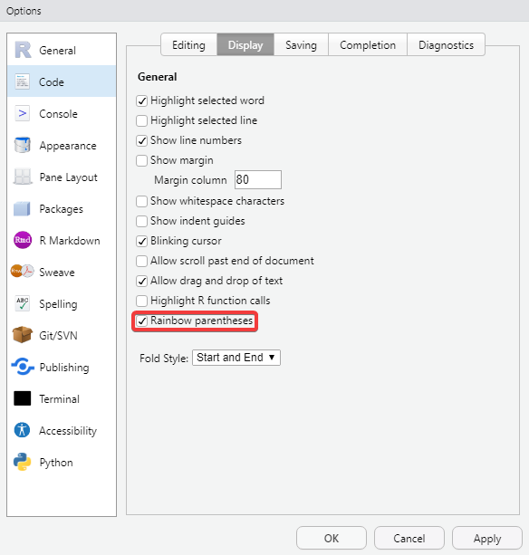 Beautiful code themes and rainbow parentheses, a tale as old as…well at least 2017 . Being able to color your parentheses (and brackets and braces) based on the level of nesting has been a highly requested feature for years and we’re happy to announce that it’s available in the upcoming 1.4 release of RStudio.