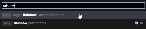 rainbowto quickly highlight theToggle Rainbow Parentheses Modeoption and select it to toggle the option.