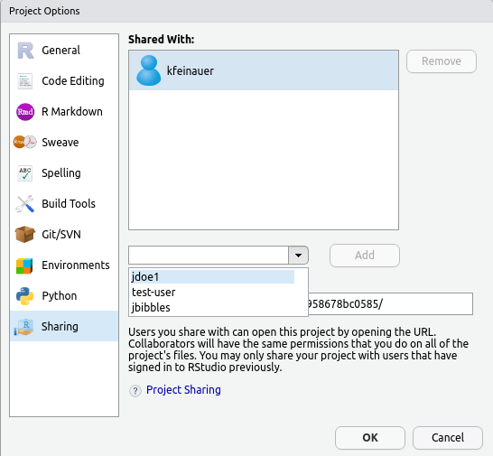 By default, when selecting the users to share projects with from within a session, only users that have signed in and used RSP will be shown, whereas previously the entire system’s users were displayed. This previous behavior was in some cases exhausting, and now also makes no sense in containerized environments (e.g., Kubernetes). The old behavior can be restored by setting project-sharing-enumerate-server-users=1 in the /etc/rstudio/rsession.conf configuration file.