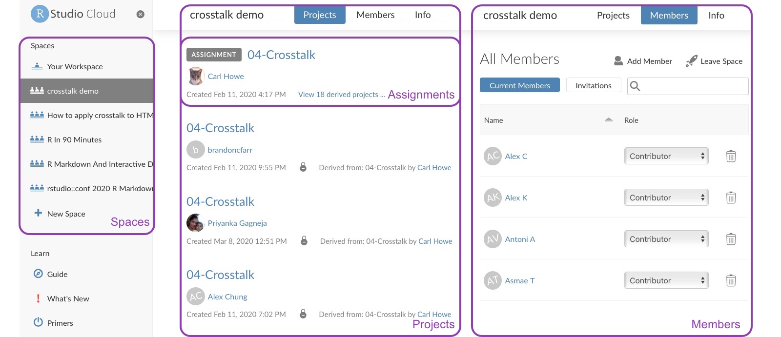 - Members: Users who can access a space. Members can be assigned different roles, giving them capabilities appropriate for instructors, TAs and students.