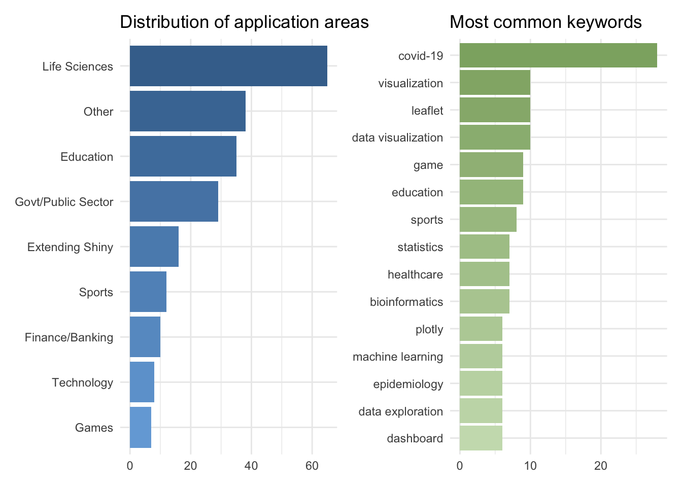 We were also incredibly impressed by the wide variety of application areas of the submissions. The figures below shows the distributions of categories and keywords for the app submissions. Perhaps unsurprisingly, lots of submissions involving COVID-19 data! Note that especially the categories plot likely underestimates the diversity of application areas since it can be quite difficult to classify some apps into a single category.