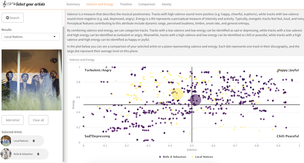 Curious about the sentiment of your favourite artists? And how do they compare to other artists? Are specific artists changing their musical style over time? And do they vary more in their musical creativity than others? Answers to these type of questions can be found in this app that is inspired, in part, by one of last year’s winning submissions, the Sentify app.