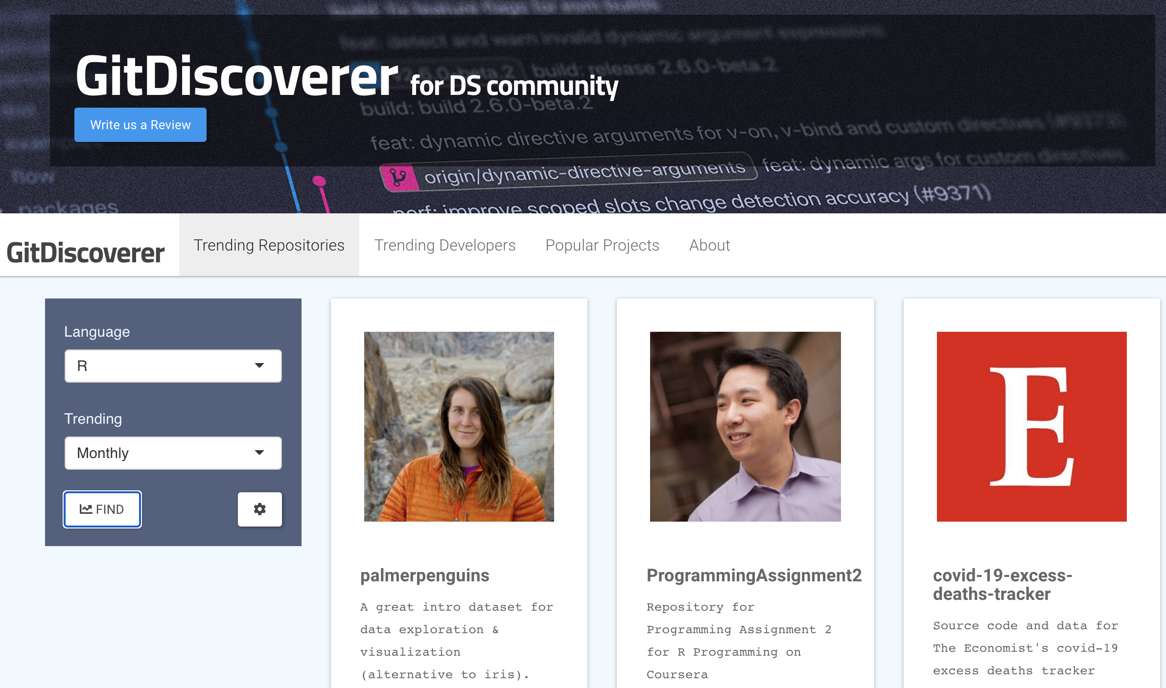 This project is re-work the app author’s submission for RStudio Shiny Contest 2019. The re-worked app features popular machine learning and deep learning projects on GitHub, dynamic rendering, functionality to sort by trend, stars, and forks as well as a disconnect screen for Shiny Server.