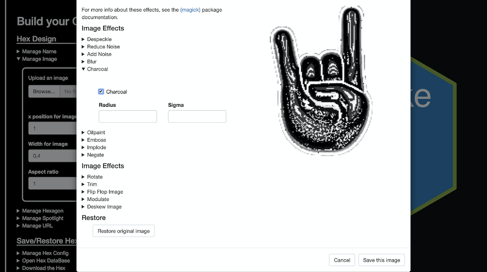 An application to build your own hex sticker. Allows to customise name, font, colours, to manipulate the image, to export the hex and to save it in an open hex database.