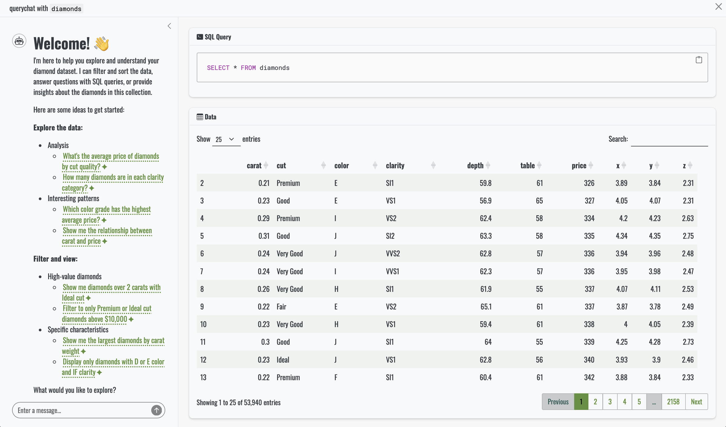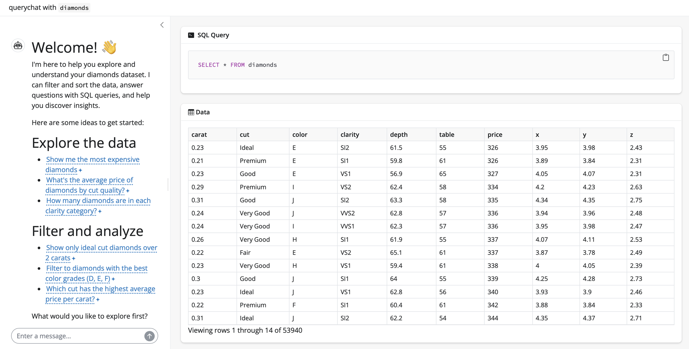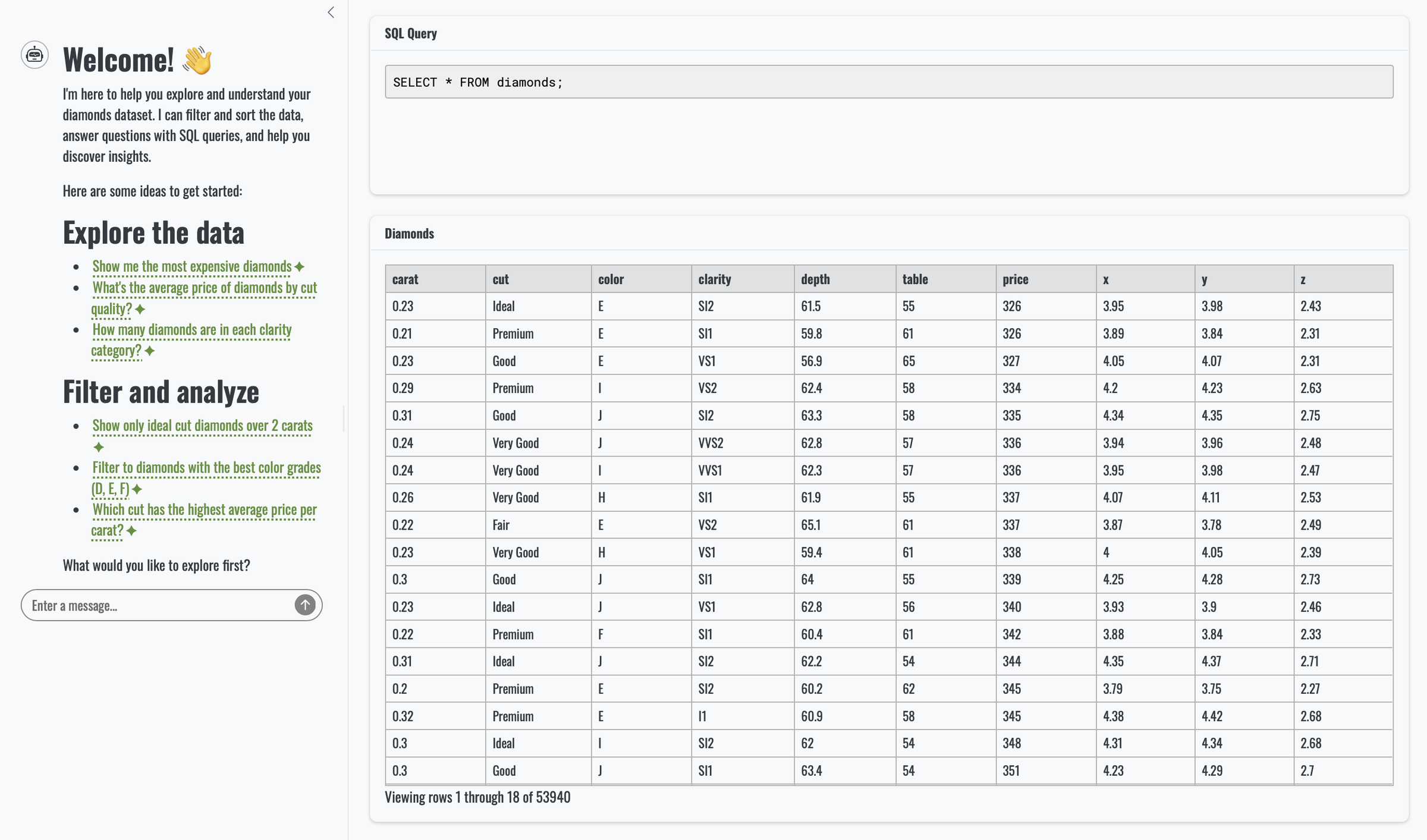 1 2 3 4 5 6 7 8 9 10 11 12 13 14 15 16 17 18 19# Welcome! 👋 I'm here to help you explore and understand your diamonds dataset. I can filter and sort the data, answer questions with SQL queries, and help you discover insights. Here are some ideas to get started: ## Explore the data * <span class="suggestion">Show me the most expensive diamonds</span> * <span class="suggestion">What's the average price of diamonds by cut quality?</span> * <span class="suggestion">How many diamonds are in each clarity category?</span> ## Filter and analyze * <span class="suggestion">Show only ideal cut diamonds over 2 carats</span> * <span class="suggestion">Filter to diamonds with the best color grades (D, E, F)</span> * <span class="suggestion">Which cut has the highest average price per carat?</span> What would you like to explore first?R#