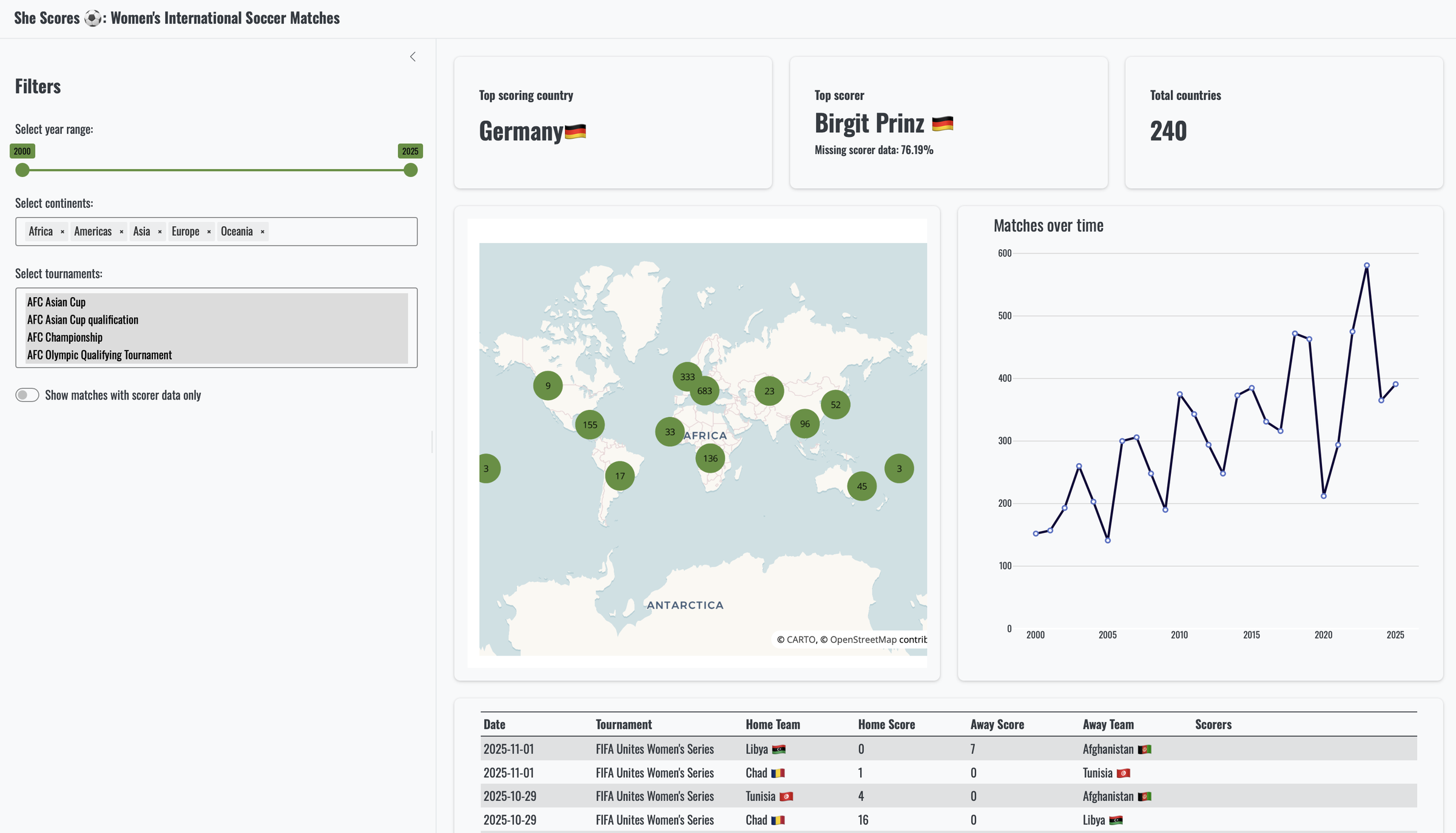To demonstrate how easy it is, we are going to use an existing dashboard (SheScores), that currently has a number of filters in it: a slider for the year(s), a dropdown for the continent where the matches took place, the tournaments that took place on those continents, and a switch that filters the data to include only data with known scorers, or not.