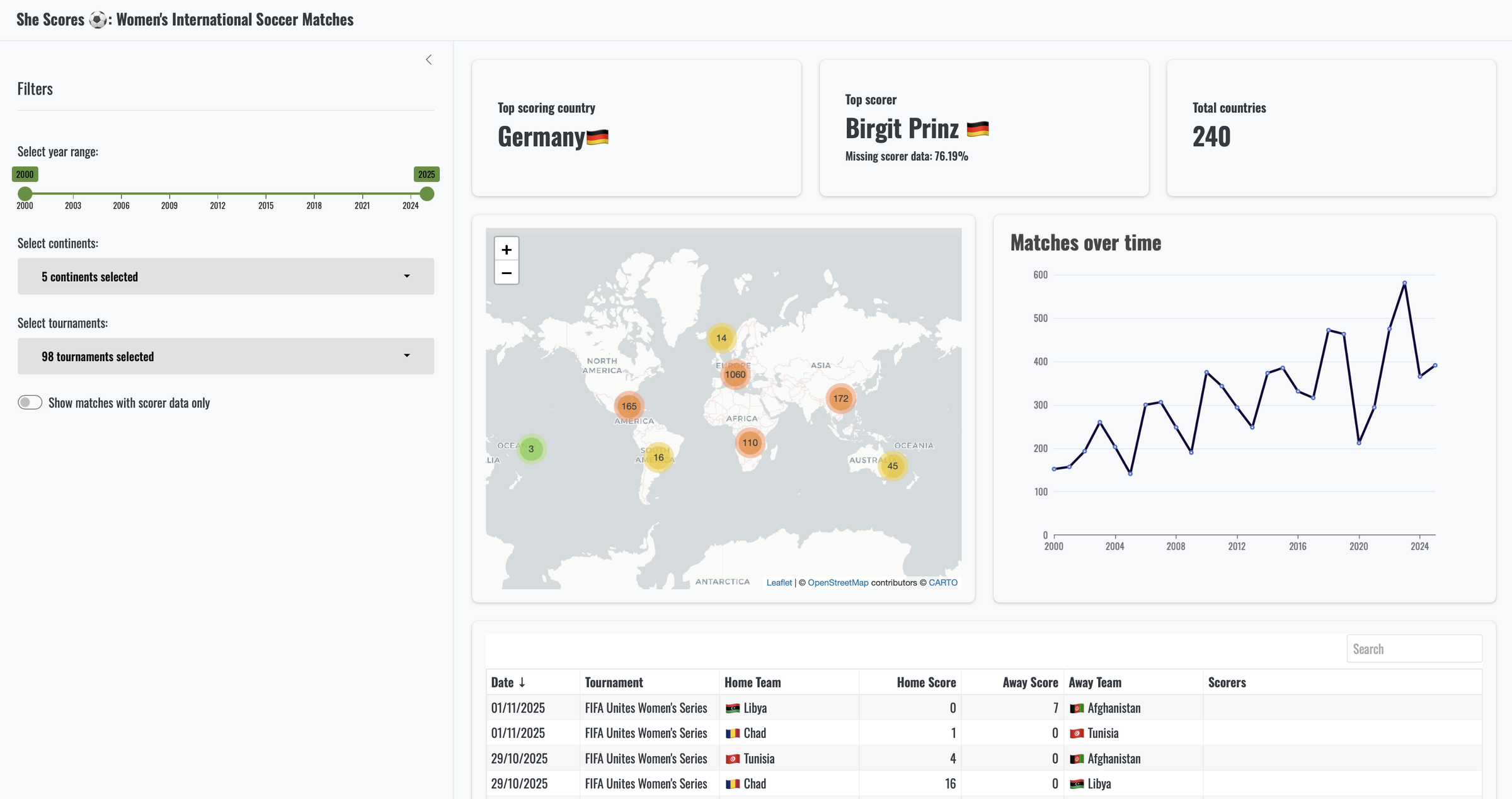 - SheScores, the soccer dashboard that you were so proud of earlier. This app originates from the shiny::conf(2024) workshop “Shiny 101: The Modular App Blueprint” , although it has been tweaked to make it a bit more interesting and updated with matches through to November 2025.