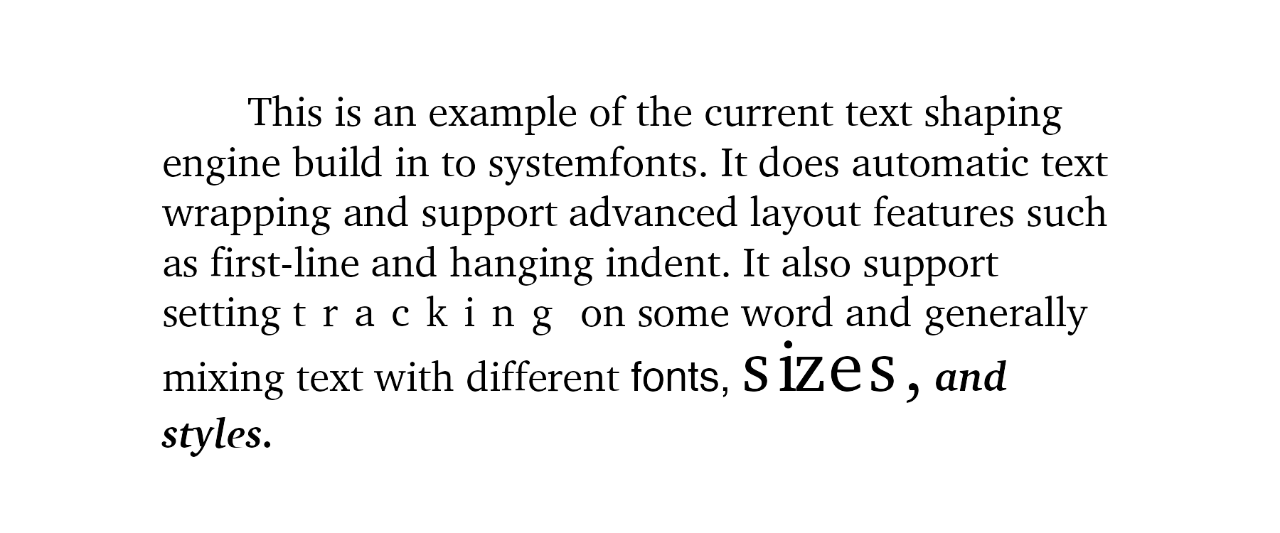 There are simply so many issues related to how finding the font files, reading the content, figuring out the correct glyphs for a character string, and determining the correct position of each glyph, that most applications use high-level solutions such as those provided by the operating system or e.g. Pango . This is not really an option for graphic devices as text is used in many other ways than the standard “text box” use that the high-level solutions are tailored to. All-in-all this makes it rather difficult to do fully correct text rendering on graphics device.