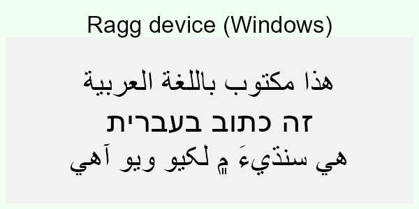 If you’re not familiar with the languages above it can be hard to see what is right and what is wrong. You may, however, look at how the text in the code is rendered in the browser and compare that to the device rendering. If you do that, you can see that the Hebrew script is rendered in the wrong direction for all the non-ragg devices (except Cairo on Linux). For the Arabic and Sindhi it’s even harder to see what’s wrong because the text looks fundamentally different. That’s because both Arabic and Sindhi rely extensively on text substitution rules and ligatures; the way a letter is written depends critically on what letters it is next to. Still, by comparing to the browser rendering you can see that the same devices failing on the Hebrew script fail here as well.